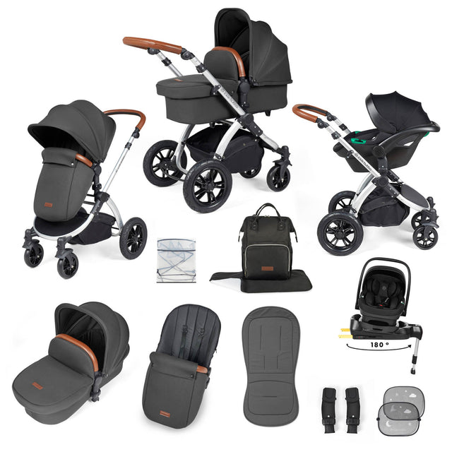 Ickle Bubba Stomp Luxe 12 Piece Travel System with i-Size Nimbus Car Seat & Spin Base - Silver/Charcoal Grey/Tan
