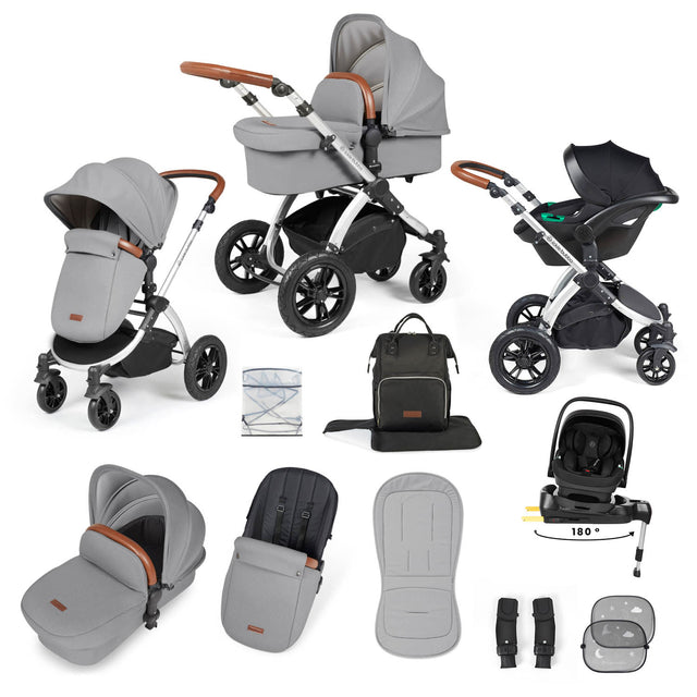Ickle Bubba Stomp Luxe 12 Piece Travel System with i-Size Nimbus Car Seat & Spin Base - Silver/Pearl Grey/Tan