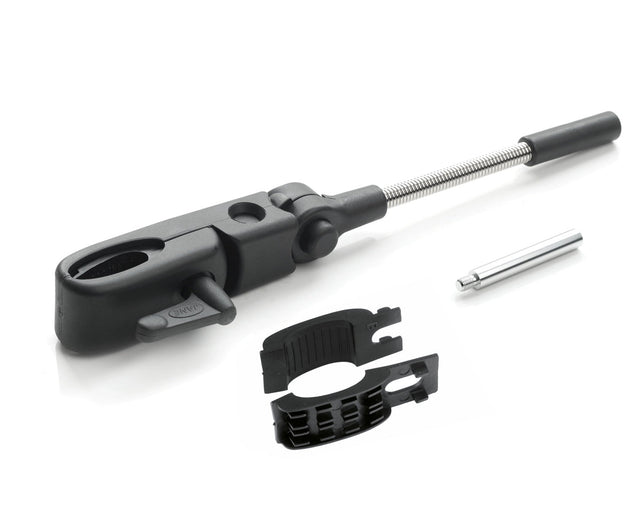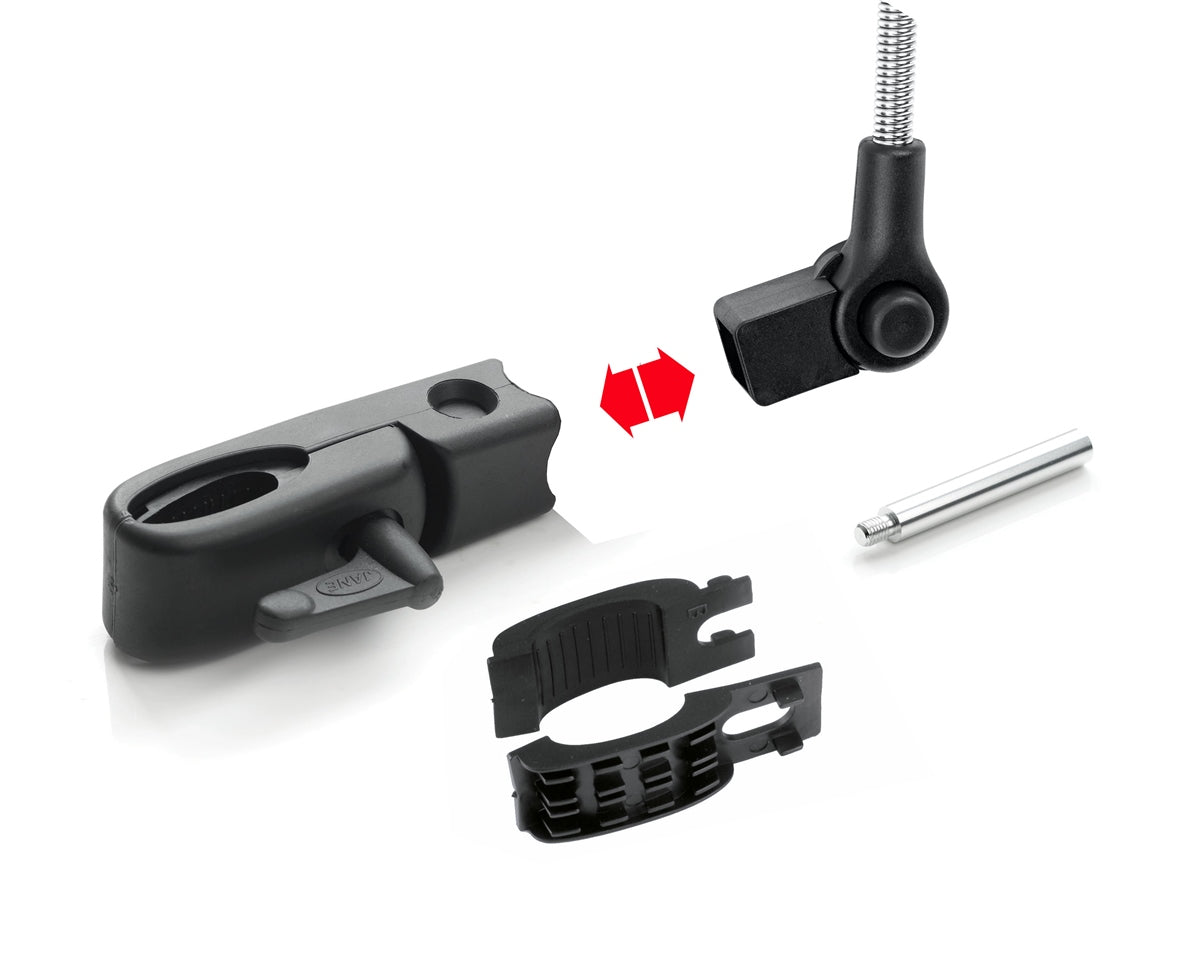 - Universal clamp with rubber band inserts to adapt to different thickness and shaped pram chassis.