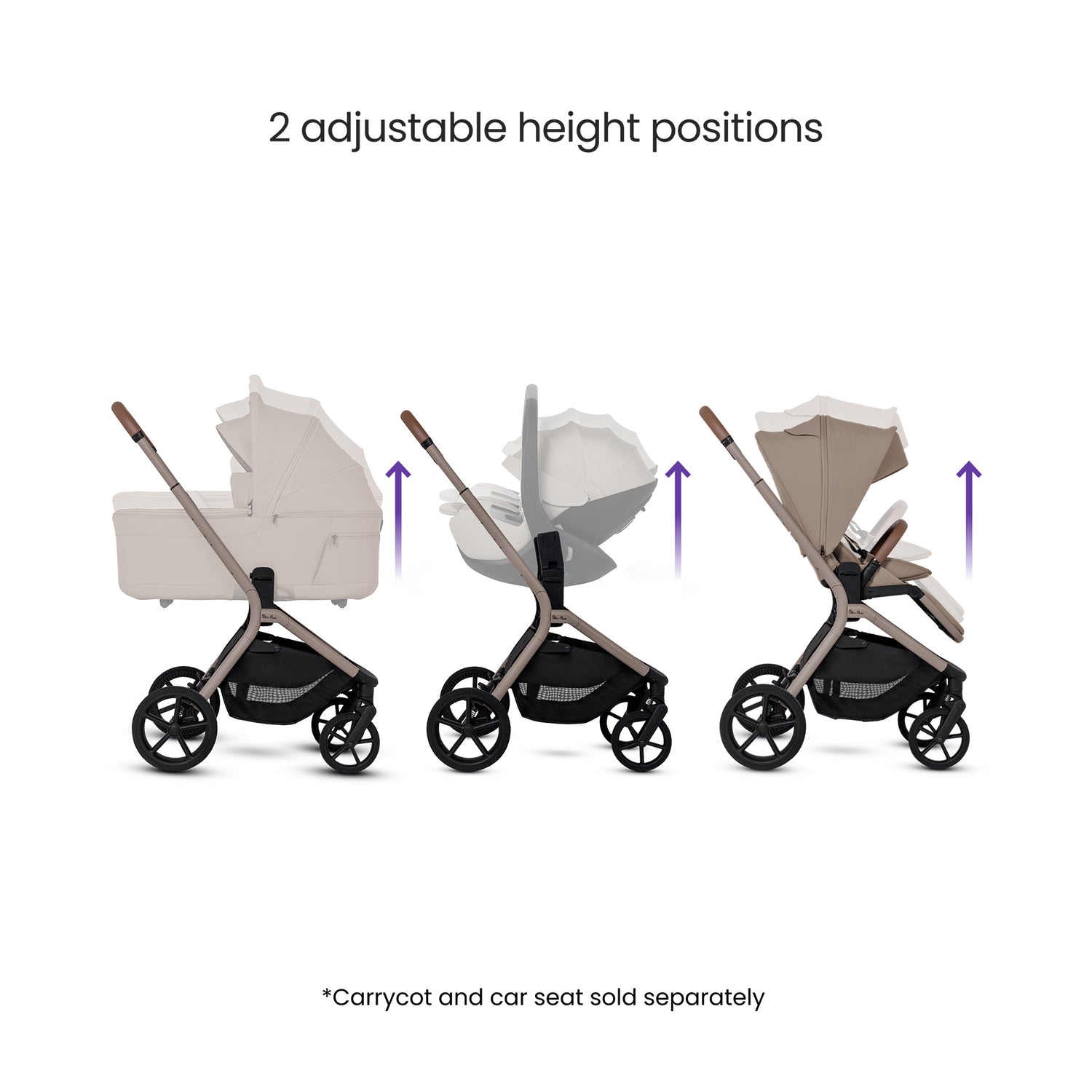 2-height elevation system brings baby closer in carrycot, stroller or car seat